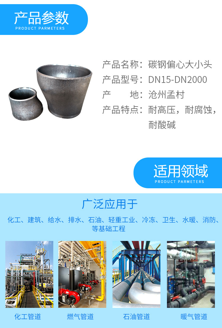 額定載重: 偏心大小頭指圓心不在同一條直線上的大小頭。其作用是貼墻或者貼地走管線而不占用空間,而且是連接兩個不同口徑的管道,改變流量的大小。