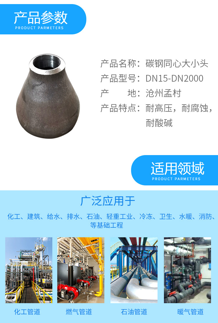 碳鋼大小頭主要應(yīng)用行業(yè) 1.碳鋼大小頭可適用于化工、石油、冶金、輕工、電力、水暖、食品、藥品、纖維、油墨等行業(yè)的水、氣、汽、油品及腐蝕性介質(zhì)的控制。 2.衛(wèi)生級(jí)閥門(mén)、流體管件,特殊行業(yè)專用管件及機(jī)械配套設(shè)備可用于乳品、制藥、啤酒、飲料、食用油等行業(yè),滿足其 級(jí)要求。 3. 按照不同的標(biāo)準(zhǔn)體系生產(chǎn)的產(chǎn)品,可適合于相應(yīng)的配套設(shè)備標(biāo)準(zhǔn)體系,并可按用戶的要求,生產(chǎn)非標(biāo)產(chǎn)品,適用特殊用途。
