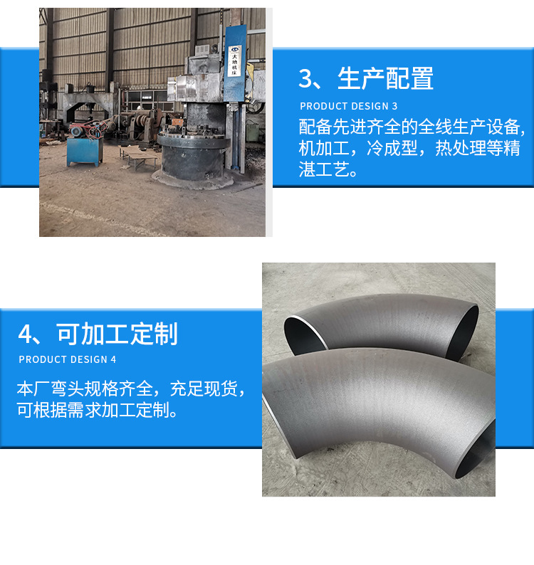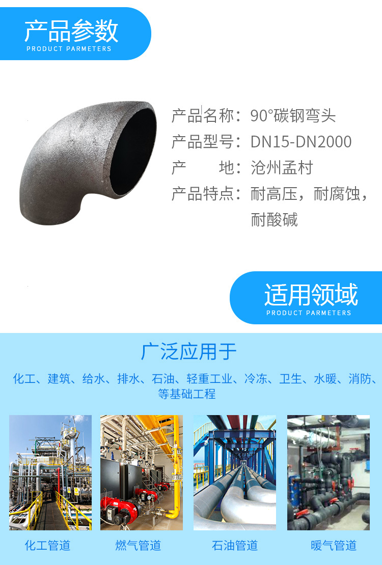 (4)碳鋼彎頭適用于石油、氣、化工、水電、建筑和鍋爐等行業(yè)的管路系列。